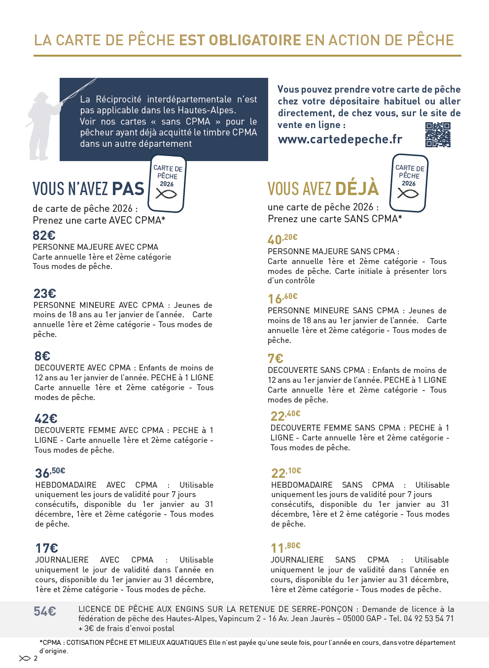 Le prix des cartes de pêche est très accessible en comparaison de la majorité des autres activités, conformément au souhait des Fédérations de pêche, Nationale et Départementales. Posséder une carte de pêche des Hautes-Alpes, c’est l’avantage de pouvoir pêcher dans tout le département. La réciprocité départementale, cette entente précieuse, ouvre des possibilités de pêches multiples et variées : torrents, petites et grandes rivières, lac de Serre-Ponçon, étangs, plans d’eau et lacs d’altitude. Le pêcheur peut pratiquer librement sur le parcours de son choix. Acheter sa carte c’est participer réellement à la protection des milieux.